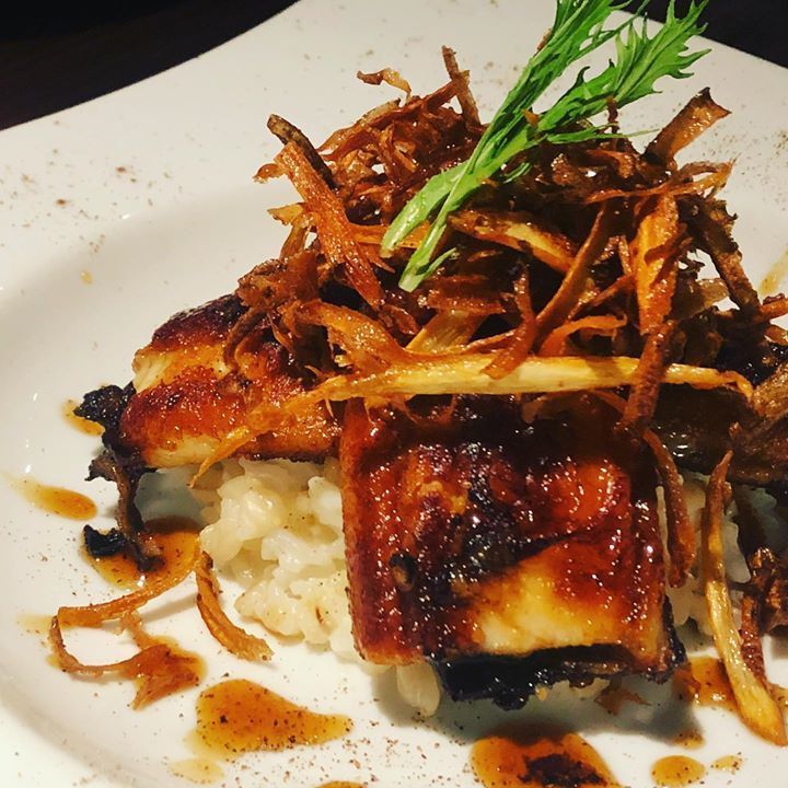 鰻のローストに押し麦のチーズリゾットとサクサクのゴボウの素揚げがのった花椒香る一品です♪
