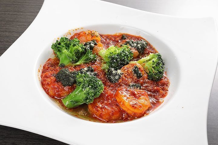 プリプリの海老とブロッコリーを特製ピリ辛トマトソースと大葉のジェノベーゼのWソース!ピリ辛で体を温めてくれる他にはない特別なエビチリです!