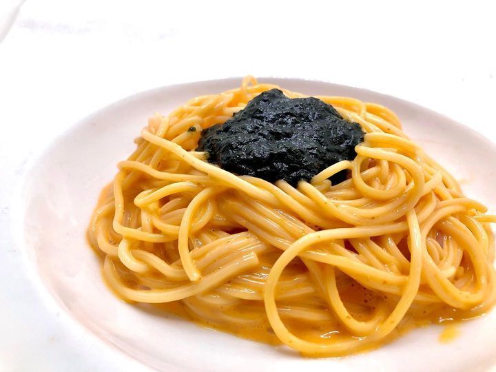 ウニと卵黄を使った濃厚なパスタに、一度炙って香りを出した海苔を使った特製ソースを添えた一品!