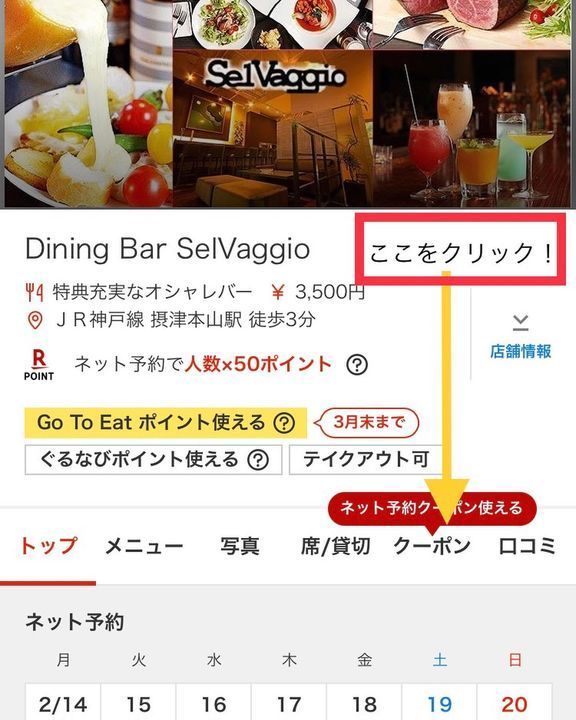 当店のぐるなびトップページにあるクーポンのタブをタップしてもらえると、