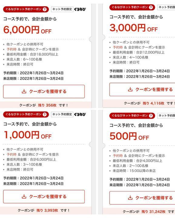 ※来店人数、来店時間、グループの最低利用金額などが、それぞれのクーポンによって違います。