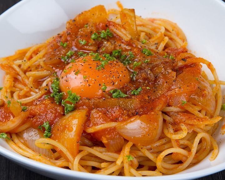食べ応えバツグンの厚切りベーコンと香ばしく仕上げた焼き玉ねぎをつかった濃くうまトマトソースに卵黄を絡めて食べてもらうパスタです^_^