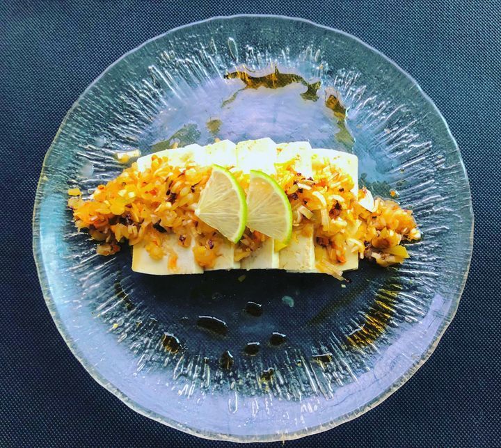 お豆腐に白葱やザーサイ、ガーリックチップなど色々混ぜた特製ソースをたっぷりかけた夏のアテには最高の一品♪