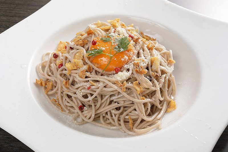 キリッとコシのある和そばをニンニクと特製和風出汁のソースと卵黄を絡めて食べていただくメニューです♪