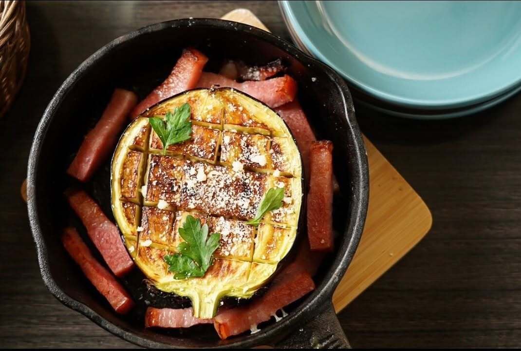 ゴロゴロベーコンと丸茄子の釜焼きステーキ