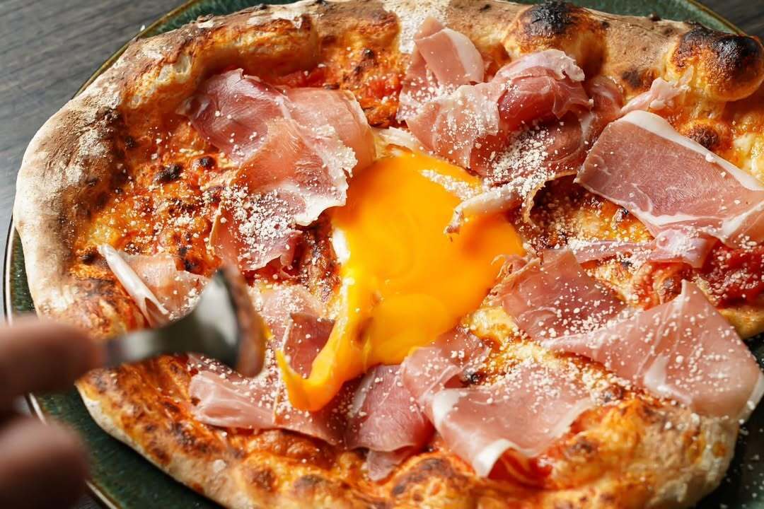 削り立ての生ハムと半熟卵を合わせたボリューミーなピザ!トロトロクリーミーな半熟卵と旨みの効いた生ハムのバランスが絶妙です♪