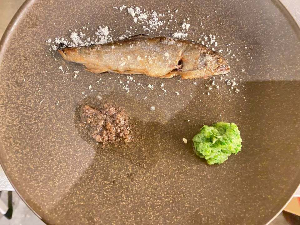 徳島県の清流で育った最高品質の鮎を使った一皿をご紹介します✨。鮎を窯焼きにして、外はカリッと中はしっとりと仕上げました。さらに、鮎の肝をバターと合わせてソースにすることで、濃厚で奥深い味わいを引き出しています🤤。この特製バターソースと、きゅうりとビネガーを使ったさっぱりとしたソースが鮎の旨味を一層引き立てます🍋🥒。